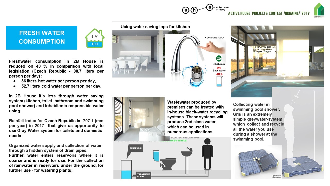 Потребление пресной воды в 2B House снижено на 40% по сравнению с местным законодательством (Чехия — 88,7 литра на человека в день):