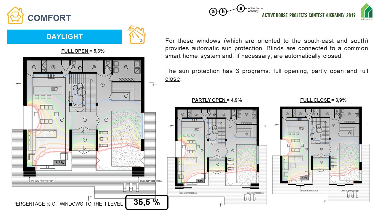 Одним из показателей комфорта Active House является КЕО (коэффициент естественной освещенности) и процент остекления в помещении относительно площади пола комнаты.