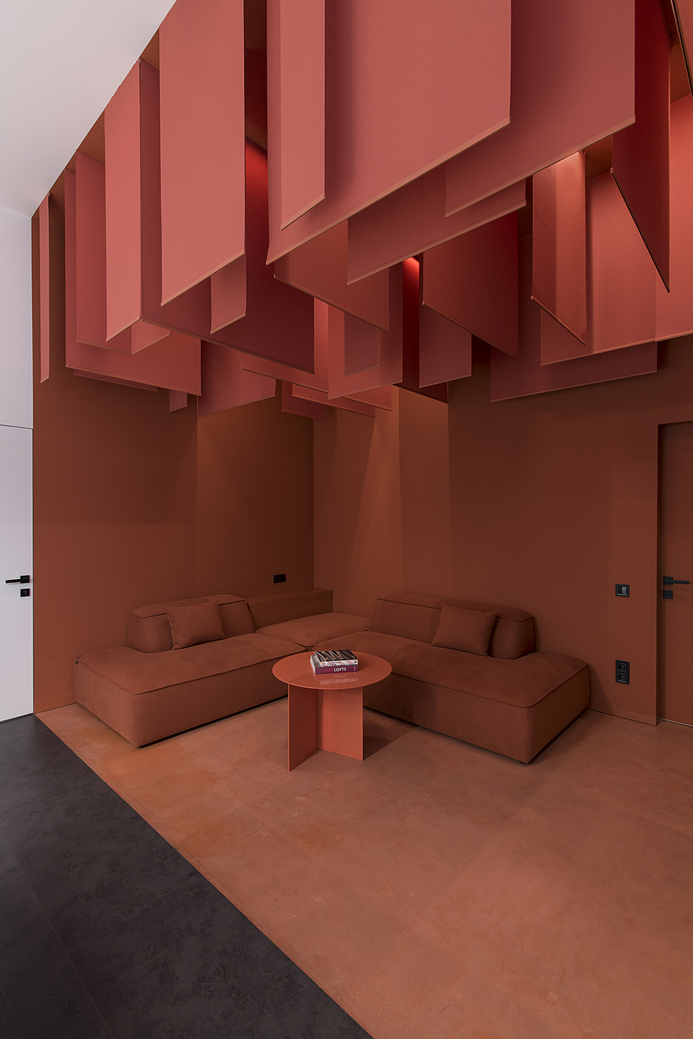 Сердце штаб-квартиры — переговорная с хорошей акустикой, элегантной геометрией, и акцентным цветовым решением в зоне отдыха. Здесь проводятся собрания, переговоры, семинары и презентации новой продукции. Качественная акустика переговорной достигается за счет полукруглой формы помещения, а также комбинации звукопоглощающих и –отражающих материалов звук. Звукоизоляции в дизайне офисного помещения уделили особое внимание: в комнате переговоров, например, сделали акустический подвесной потолок, который снижает уровень шума; в кабинетах – использовали звукопоглощающе панели, которые вписались в современный интерьер офисного пространства. Офис также оснастили современными инженерными системами: датчики температуры, влажности, наличие необходимых выводов под технику, видеонаблюдение и охранную сигнализацию. Лаунж зона задумывался как место неформальных переговоров, где можно посидеть за чашкой кофе и обсудить детали проектов, но получилась такой удобной, что многие сотрудники уже планируют периодически менять место работы — поработать в неформальной обстановке.